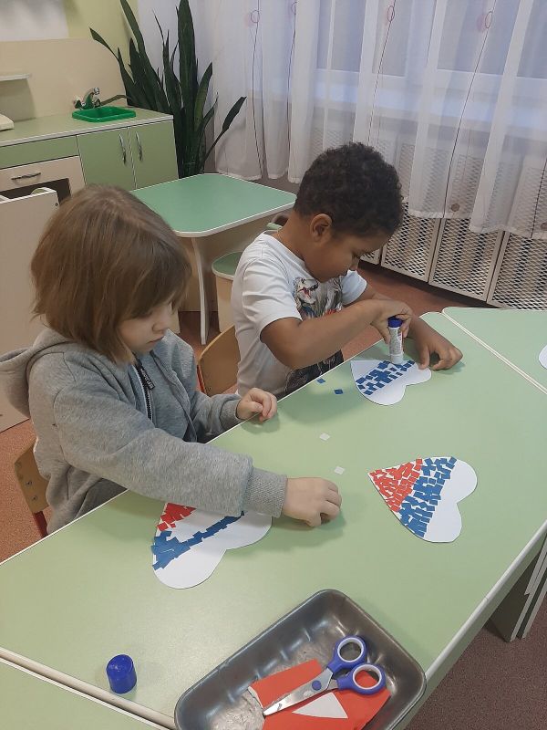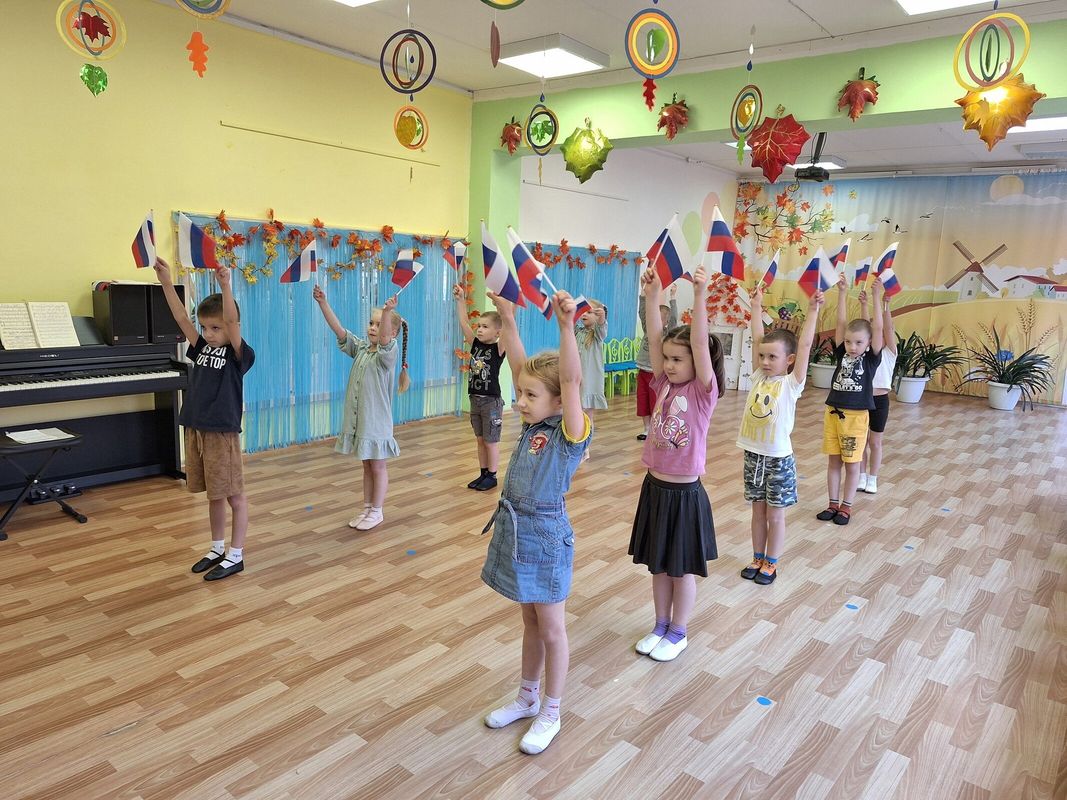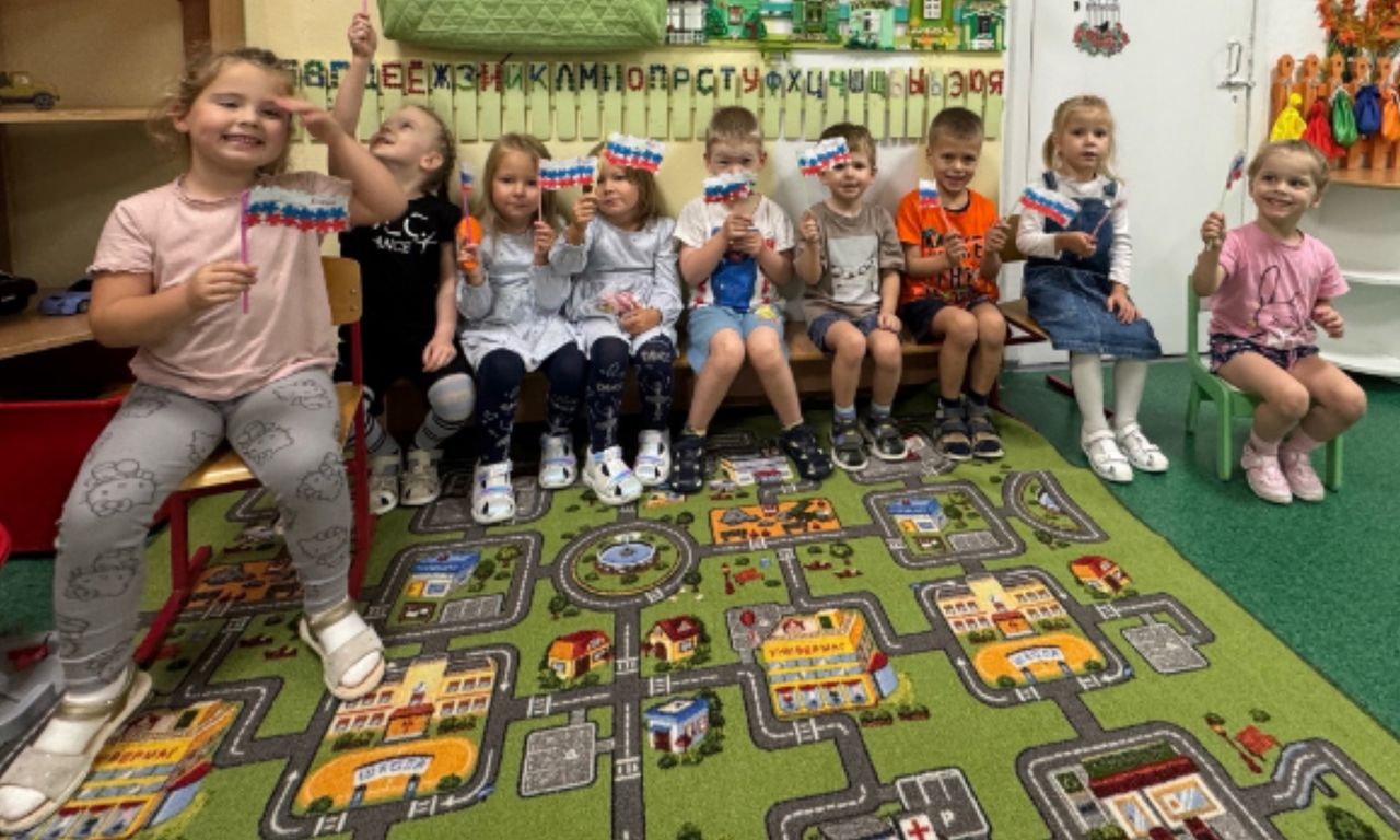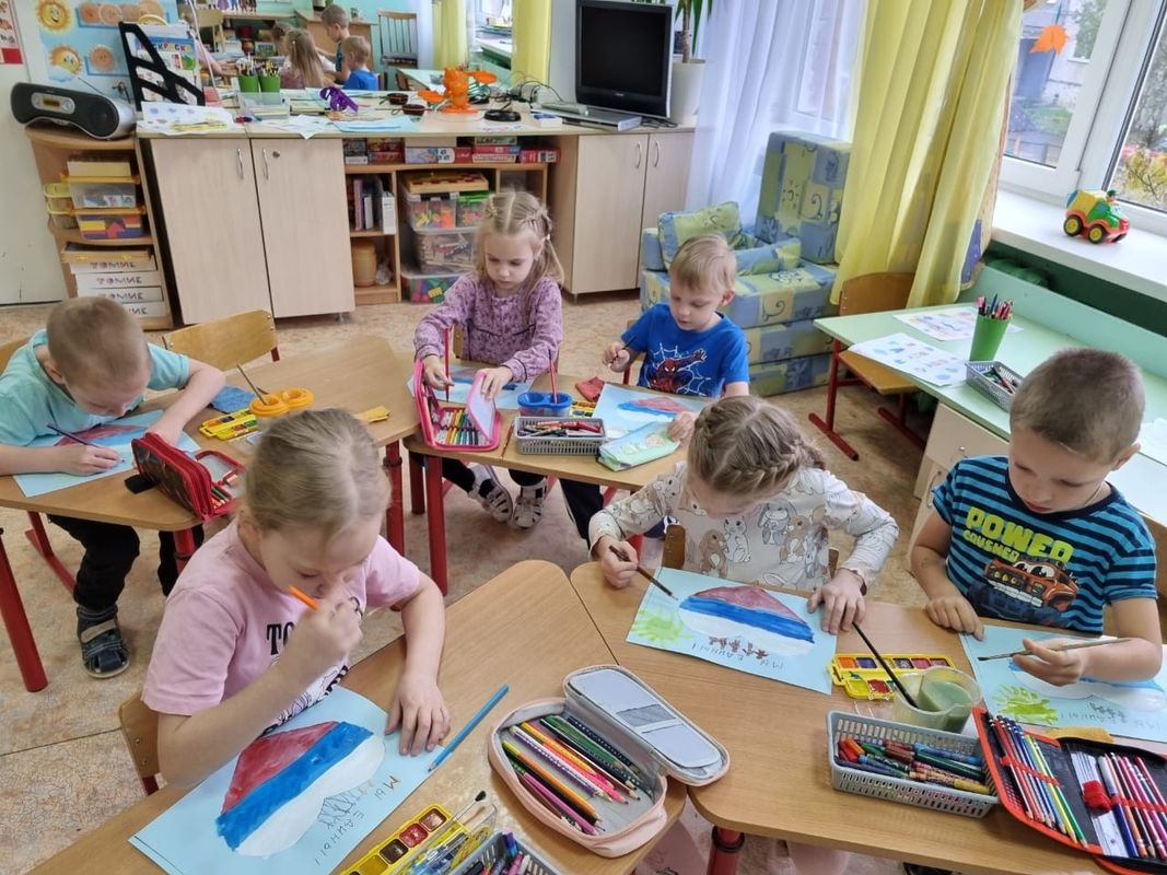 в средней группе "Незабудки" прошло тематическое занятие, на котором детей познакомили с флагом России, выполнили аппликацию, закрепив расположение цветов и их значение.