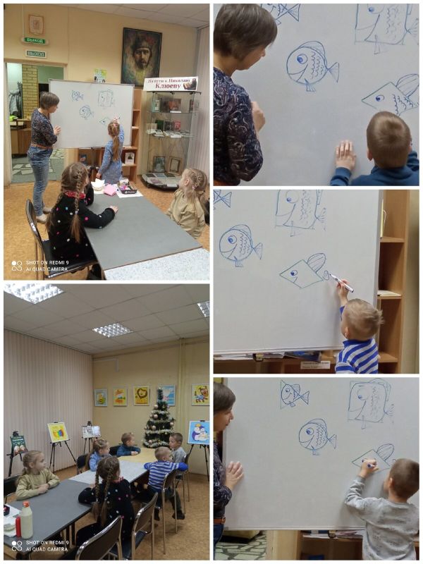 Дети, вместе с художницей нарисовали рыбок🐟🐠🐡, дорисовав простые геометрические фигуры🟠🟩🔷.